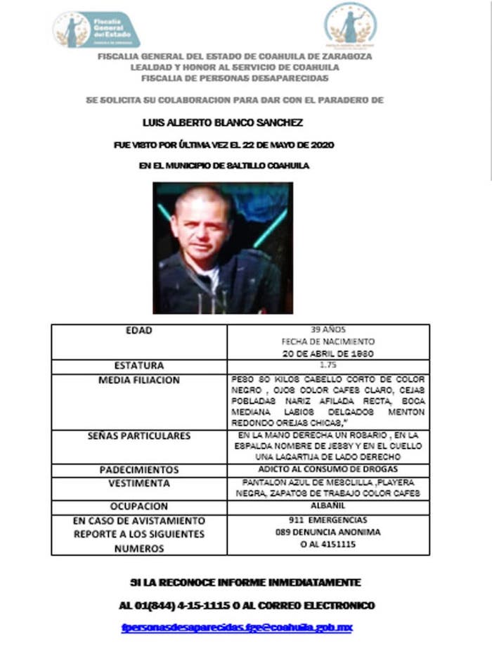Saltillo, 3 de junio (Vanguardia).- A 13 días de su desaparición, la familia de Luis Alberto Blanco, denunció que las autoridades de la Fiscalía General del Estado no le han entregado ningún tipo de respuesta sobre el paradero del hombre de 39 años, quien aseguran fue extraído de su domicilio presuntamente por agentes de la Policía el pasado 22 de mayo.