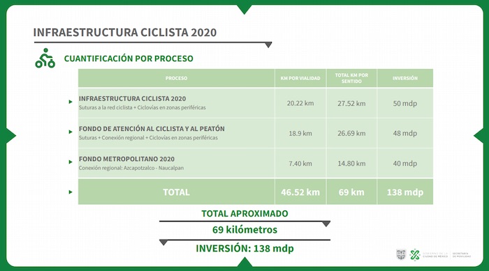 Como parte de la extensión de la red ciclista, con conexiones regionales, redes en la periferia e interconexión con el transporte público, este 2020 la Semovi de la capital del país planea construir 69 kilómetros de infraestructura con 198 millones de pesos de inversión, además de los 54 kilómetros de ciclovía emergente derivada de la pandemia por la COVID-19.
