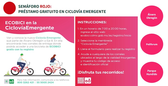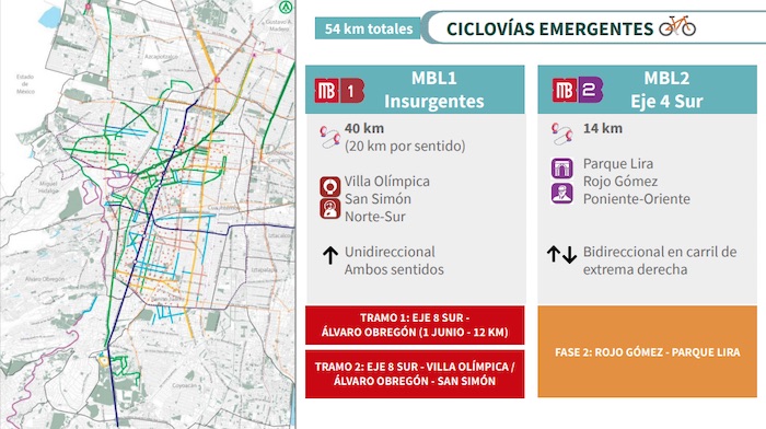 El domingo, como parte de la transición a la nueva normalidad, el Secretario de Movilidad Andrés Lajous anunció 54 kilómetros de ciclovía emergente: 40 kilómetros de Villa Olímpica (sur) a San Simón (norte) y viceversa con conexión a la línea 9 y 12 del metro; 1 y 2 del Metrobús; Tren Ligero, RTP y 56 biciestaciones; y en el semáforo naranja los otros 14 kilómetros de Parque Lira a Rojo Gómez (oriente).