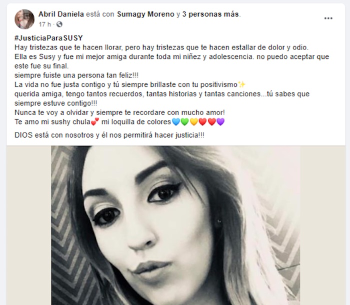 Su historia se dio a conocer hasta dos días después. En Facebook, sus amigos, amigas, familiares, vecinos y grupos feministas de la capital emprendieron la campaña #JusticiaParaSusy para exponer el caso y exigir que su feminicidio no quede impune.