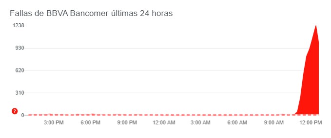 Desde poco antes de las 10:30 horas, la pagina que registra caídas y errores en páginas de internet, aplicaciones móviles y redes telefónicas, recibió las primeras quejas por la caída del servicio de la institución financiera.