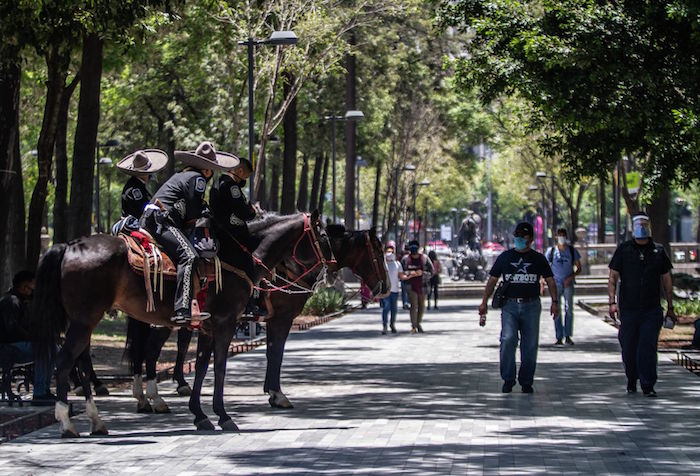 Desde el pasado 12 de junio, por la tarde, la policía montada resguardó la reapertura de la Alameda Central, mientras familias paseaban mientras portaban cubrebocas.