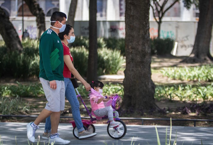 Familia pasea en la Alameda Central usando cubrebocas. Foto: Andrea Murcia, Cuartoscuro