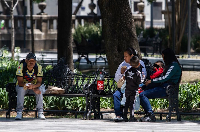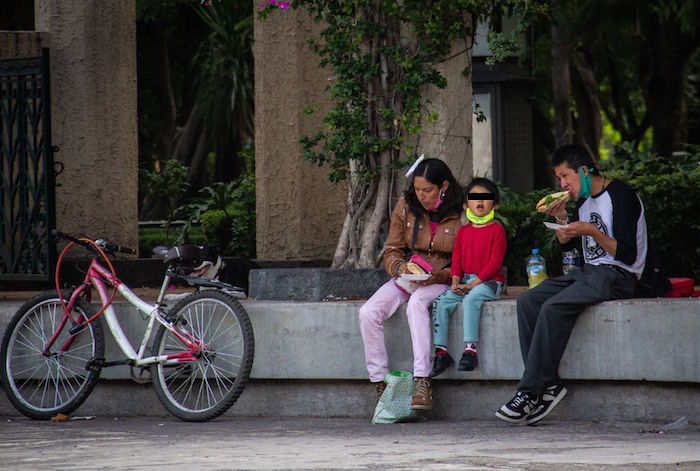Familia aprovecho la apertura de la Alameda Central para ir a las bancas a comer. Foto: Andrea Murcia, Cuartoscuro