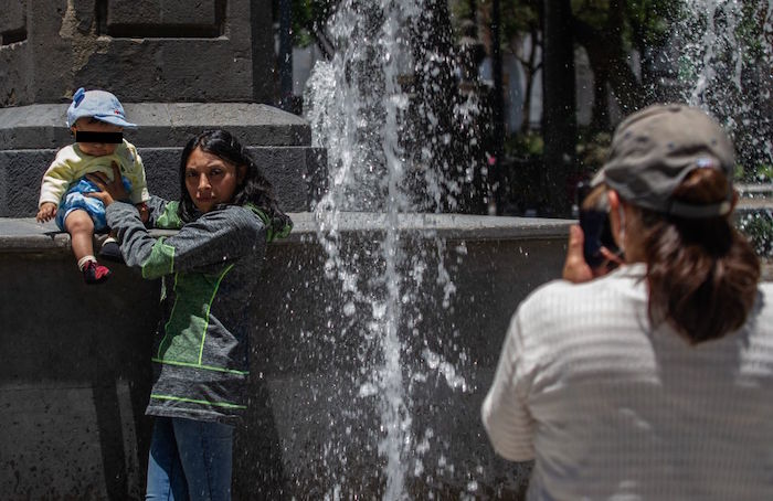 Madre e hijo se toman una fotografía en las fuentes de la Alameda Central recien abierta el día de ayer. Foto: Andrea Murcia, Cuartoscuro