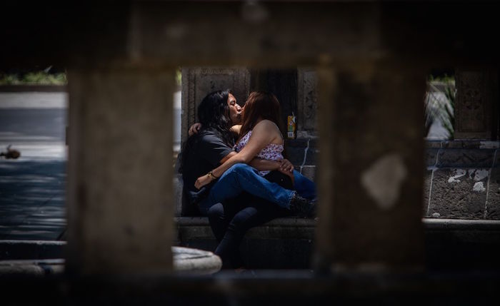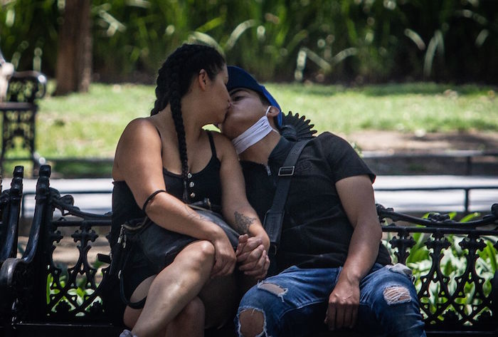 Una pareja se da un beso en una banca de la Alameda Central recien reabierta. Foto: Andrea Murcia, Cuartoscuro