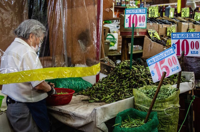 Un locatarío de la tercera edad del Mercado de la Merced implemento como medida preventiva de contagio de COVID-19 una separación de plástico para evitar el contacto directo con los clientes. Foto: Andrea Murcia, Cuartoscuro
