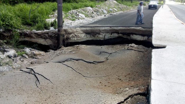 Detalló que el hundimiento pudo deberse a que la zona es cavernosa y tiene un cenote en su interior, por lo que el paso constante de vehículos pesados y las fuertes lluvias registradas en días pasados terminaron por provocar el incidente.