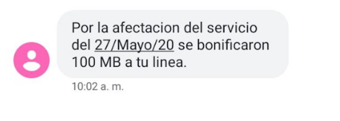 “Por la afectación del servicio del 27/Mayo/20 se bonificaron 100 MB a tu línea”, dice el mensaje enviado vía sms a los clientes de la telefónica.