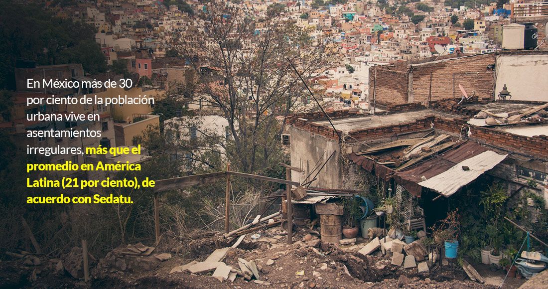 En México estamos arriba del promedio de la región, ya que más de 30 por ciento de la población urbana vive en esa situación informal (en algunas ciudades este porcentaje llega a rebasar el 70 por ciento) y una de cada cinco viviendas presenta carencias en el acceso a alguno de los servicios básicos (agua potable, drenaje sanitario, energía, entre otros), de acuerdo con la Secretaría de Desarrollo Agrario, Territorial y Urbano (Sedatu).