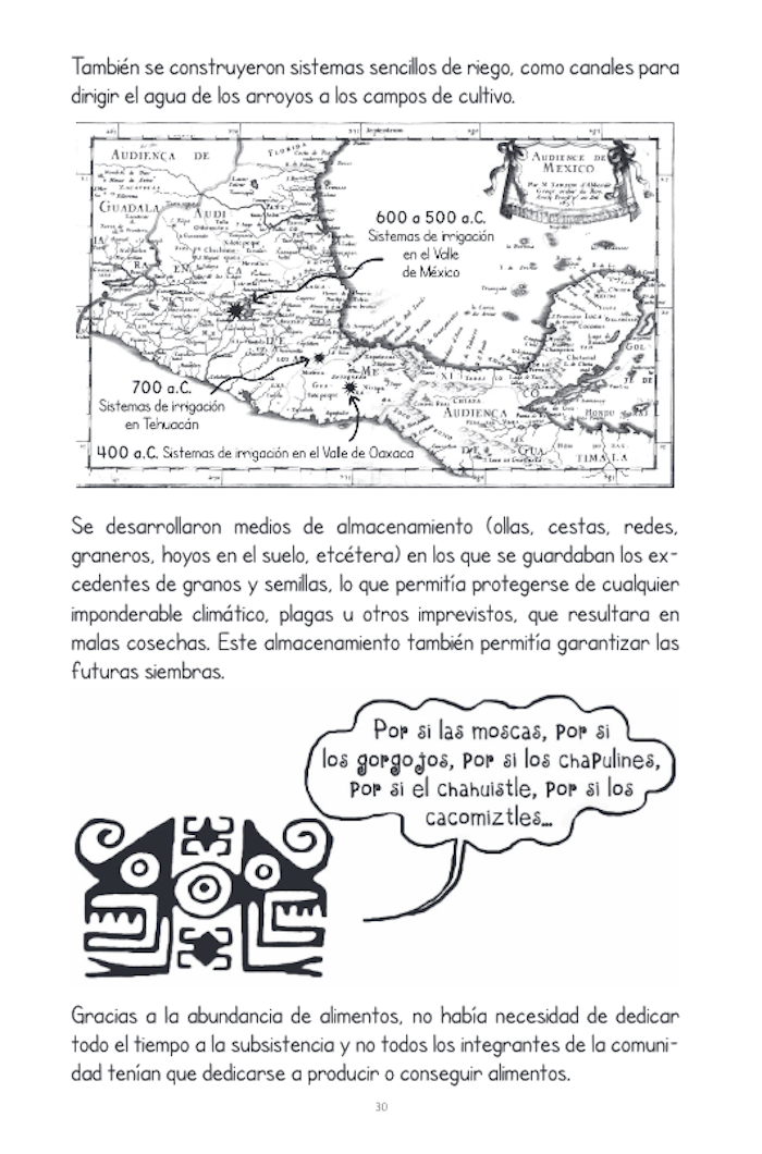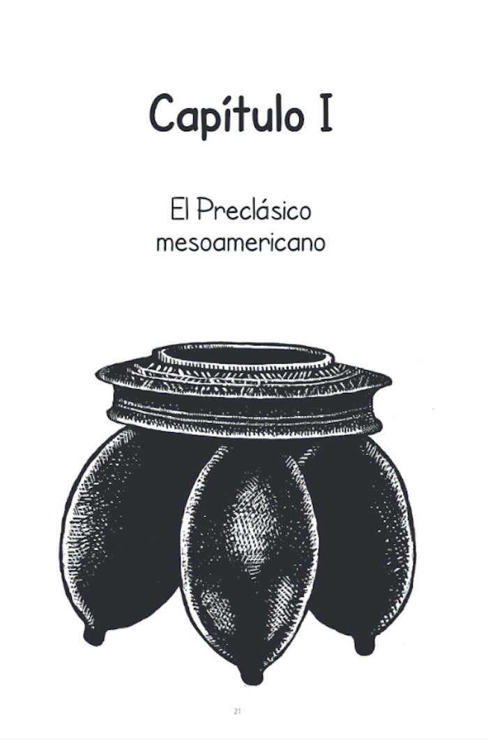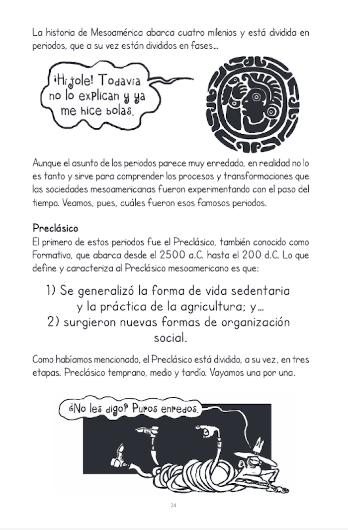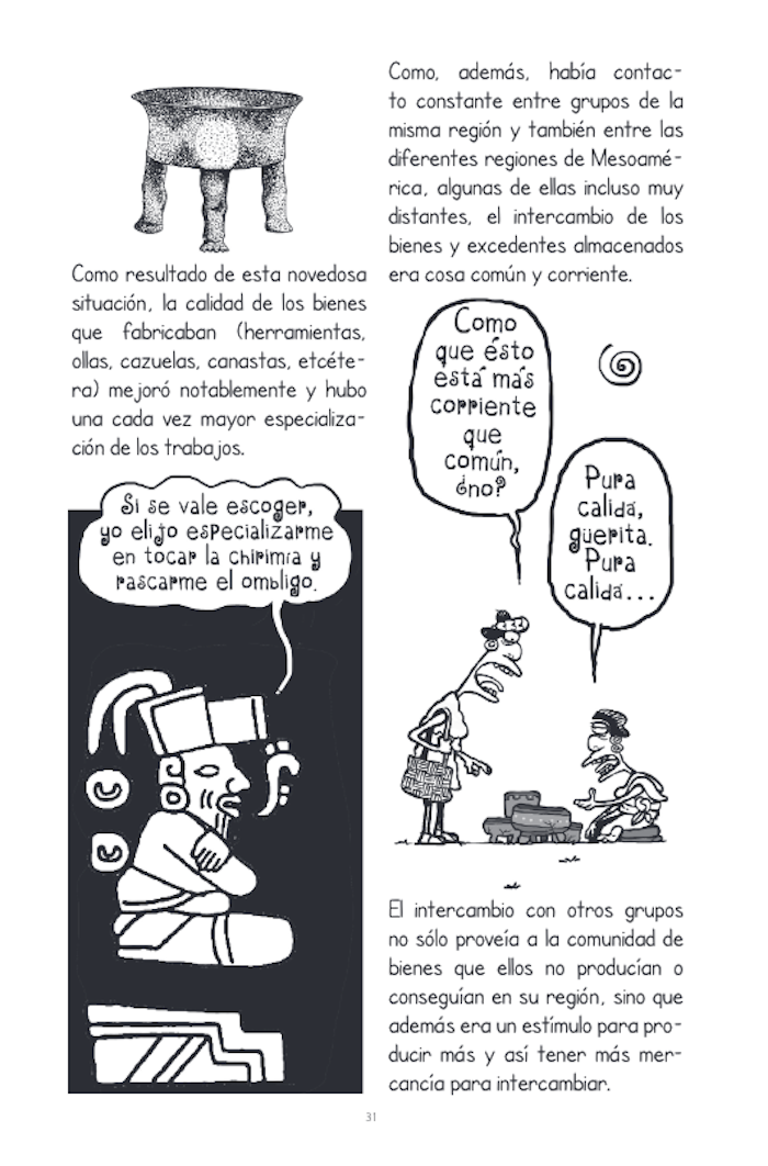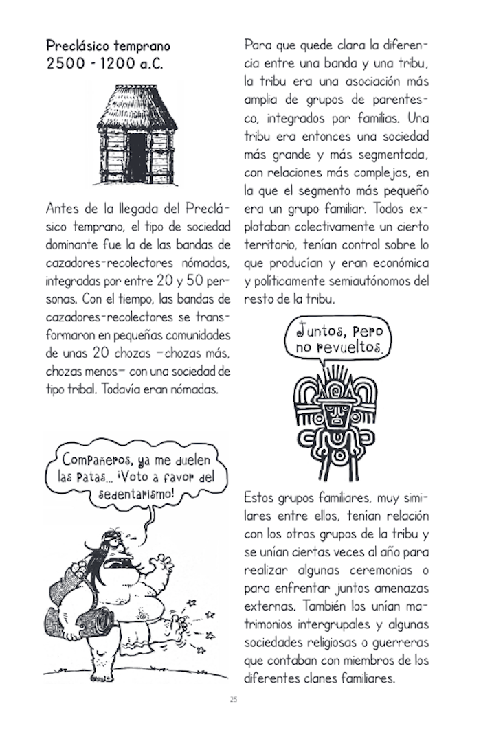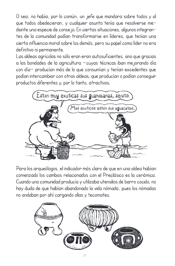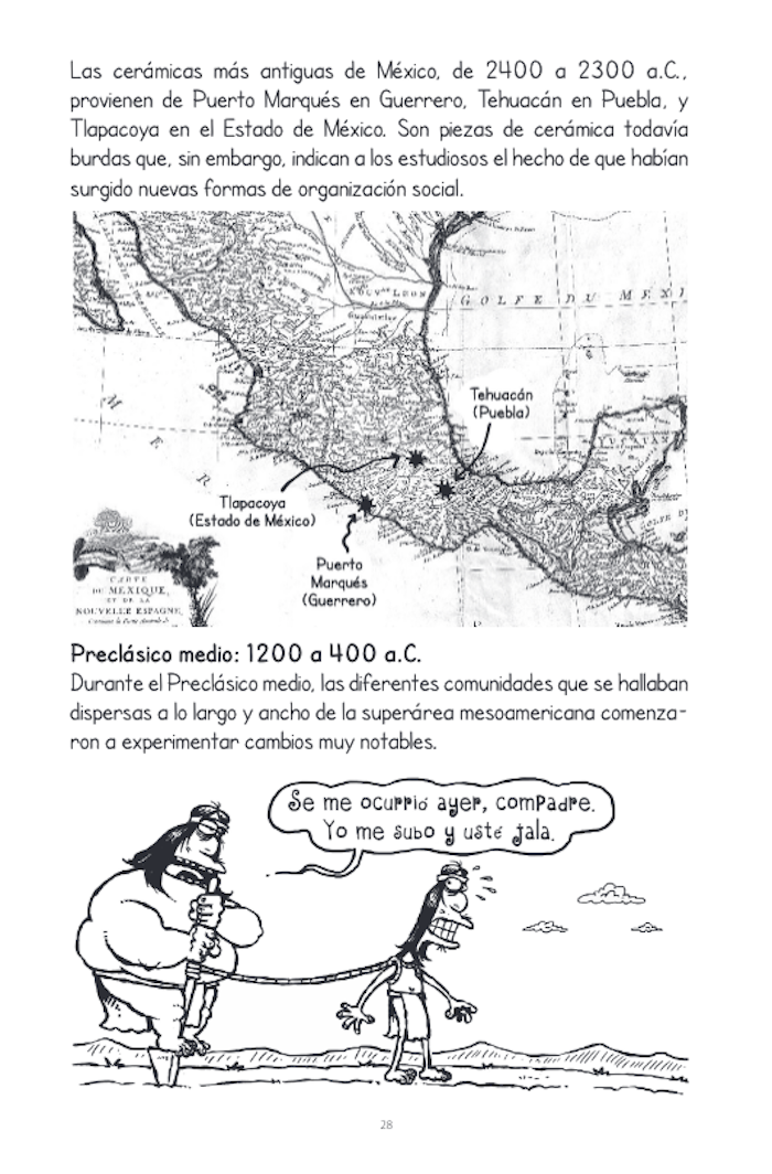 San José el Mogote en Oaxaca, sobre la incipiente urbe de San Lorenzo, en Veracruz, o sobre la repentina urbanización de Monte Albán, capital de uno de los primeros estados mesoamericanos. La particularidad e idiosincrasia de cada una de estas localidades o regiones queda ejemplificada con las ilustraciones que acompañan la narración. Por ende, los dibujos, los mapas y las caricaturas no son recursos redundantes o superfluos, sino una adición que continuamente transmite conocimiento en forma subliminal.