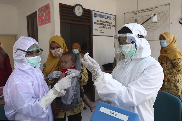 Trabajadores de la salud se preparan para administrar la vacuna del sarampión a un bebé en un centro comunitario en Tangerang. Foto: Tatan Syuflana, AP