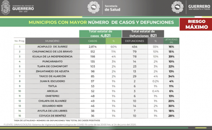 De la Peña Pintos dijo que Acapulco tiene dos mil 874 casos y 454 defunciones, y que “hay cierta tendencia a la baja en la curva” en el municipio, mientras que Chilpancingo tiene 512 casos y 79 defunciones.