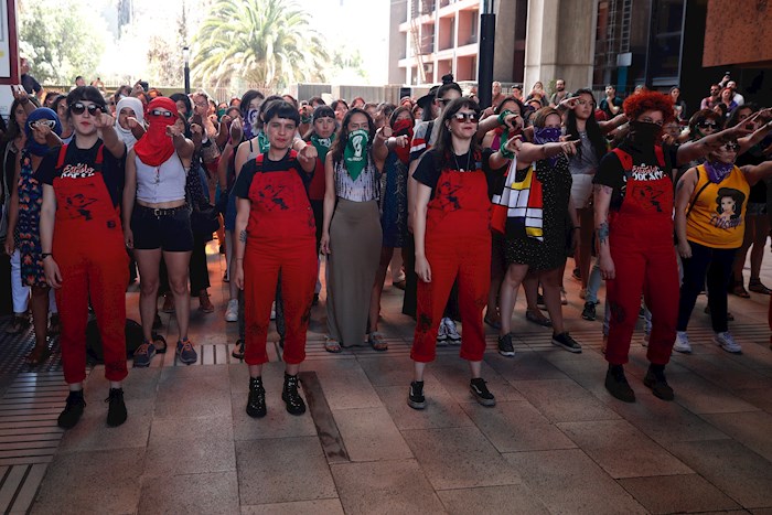 Vista del colectivo feminista Las Tesis realizando el performance del himno contra la violencia sexual "Un violador en tu camino". Foto: Alberto Valdés, EFE