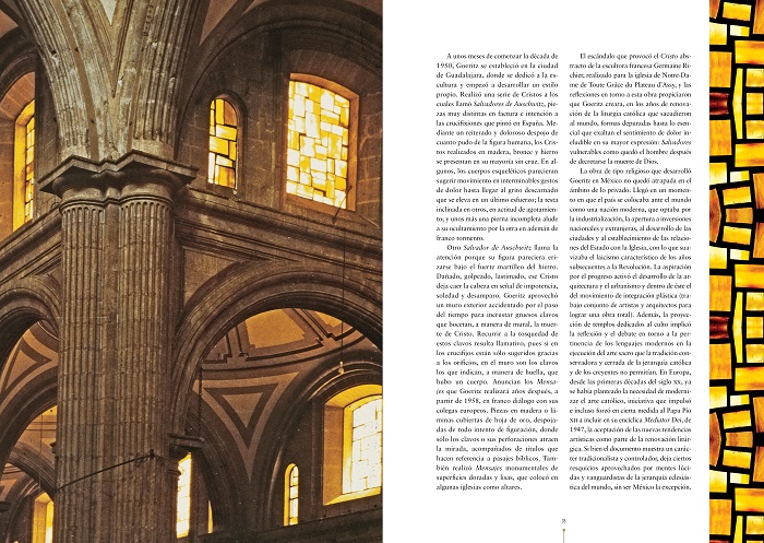 Heredero del desencanto frente al proyecto de la modernidad, Goeritz rescata la fe y un sentimiento místico liberador en sus obras y tesis estéticas. En el artículo de Ana María Rodríguez Pérez y Leticia Torres Hernández, se bosquejan las influencias del artista que van desde las búsquedas dadaístas a la escuela de la Bauhaus, con la que “compartió la utopía del trabajo anónimo, artesanal y comunitario de los procesos creativos y la interacción de las artes con un sentido humanístico y social”. Es así como sus obras pretenden reunir experiencias espirituales que modifiquen los afectos de los sujetos y, con esto, el tejido social que los implica. Dentro de esta línea, produjo una obra destinada a la renovación litúrgica de la Iglesia en la década de los cincuenta en México. Diseñó principalmente vitrales, los cuales modifican la luz en el interior de los templos y aportan un sentimiento particular del “recogimiento espiritual”. Permite repensar el arte sacro desde otros estilos de creación, como la abstracción, para apuntar al mismo objetivo a través de métodos que rompan con expresiones tradicionales del arte figurativo.