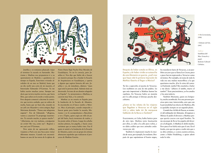 En la entrevista a Ida Rodríguez Prampolini, por Mariana Méndez-Gallardo, nos aproximamos a imágenes de la vida cotidiana del artista: al llegar a Veracruz, “Lo que más impresionó a Mathias fueron los zopilotes”. Cada encuentro tiene sus imágenes. Su cercanía nos ofrece fragmentos vitales como el momento en que modelaron figuras de arcilla juntos, inaugurando con esto el proyecto de la Escuela de Altamira —escena que capta Marianne Goeritz en 1948 y se aprecia en la página 13 rodeada de bocetos de la época. Y es que esos pequeños gestos son los que permanecen y constituyen nuestra memoria, y son estos los que, en conjunto, delinean la biografía de las personas: Goeritz regalándole el dibujo de un barquito a su hijo Daniel o cuando le obsequió a Ida Rodríguez un papel con garabatos ininteligibles hechos en sus últimos días de vida en el hospital. Este texto en particular, muestra que lo que queda abierto en la obra y en la vida tiene una potencia emocional en el recuerdo.