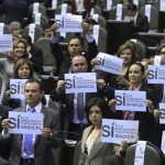 Antes, integrantes del Movimiento de Regeneración Nacional (Morena) se introdujeron al Palacio Legislativo de San Lázaro y llegaron a unos metros del salón de plenos para lanzar consignas contra los legisladores del PRI y PAN.
