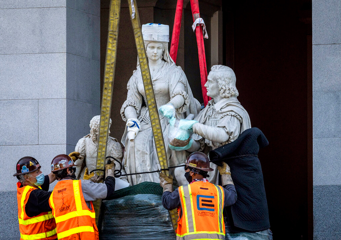 Unos trabajadores retirados una estatua de Cristóbal Colón y la reina Isabel I de Castilla del Capitolio estatal, en el centro de Sacramento, California. Foto: Daniel Kim, The Sacramento Bee vía AP