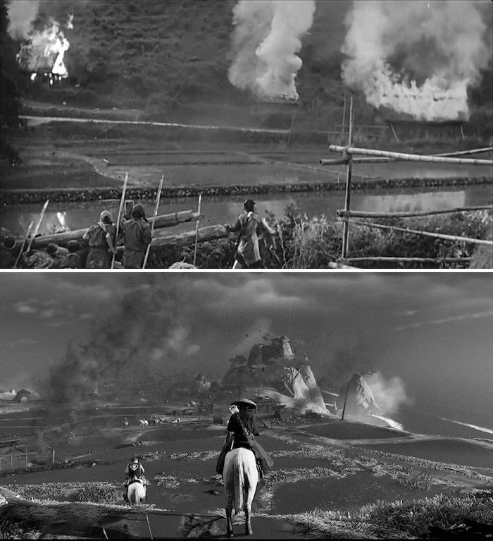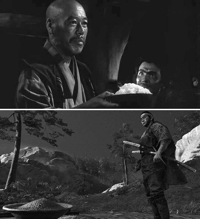 En Ghost of Tsushima también se puede comprobar. De hecho, una de sus misiones consiste en colarse en una fortaleza infiltrado en el carro de un vendedor de sake, ya que este es el único que tiene permiso para cruzar la defensa enemiga sin riesgos. Algunas las tramas secundarias también tienen como motivo recuperar las provisiones saqueadas a los campesinos. Una de ellas, que parece beber directamente de la película de Kurosawa, nos presenta a un personaje que se hace pasar por samurái para recibir comida de los aldeanos a pesar de que es el hijo de un campesino, tal como ocurre con Kikuchiyo.