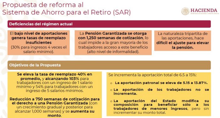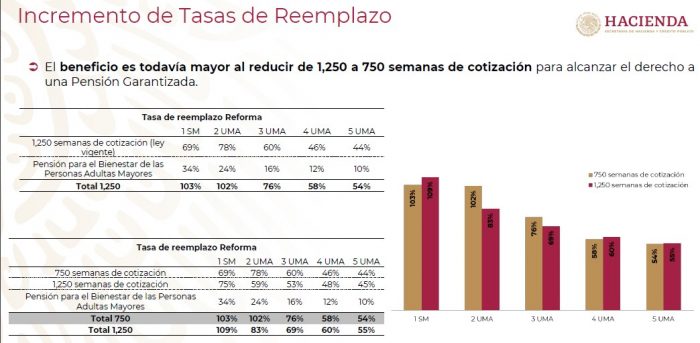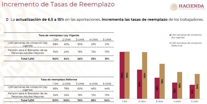 Aumentará el ingreso de la pensión. El Secretario de Hacienda, Arturo Herrera, explicó que ahora quienes ganan hasta 5 salarios mínimos tienen una tasa de reemplazo del 31 por ciento. De aprobarse los cambios, cada persona que gane el equivalente a hasta 5 Unidad de Medida y Actualización (UMA) la tasa elevaría hasta el 54 por ciento.