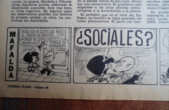 No obstante, el nacimiento oficial de Mafalda (fuera de todo acuerdo comercial) fue el 29 de septiembre de 1964 en la revista argentina Primera Plana, donde empezó a aparecer con cierta regularidad y a convertirse en todo un fenómeno humorístico dentro del país.