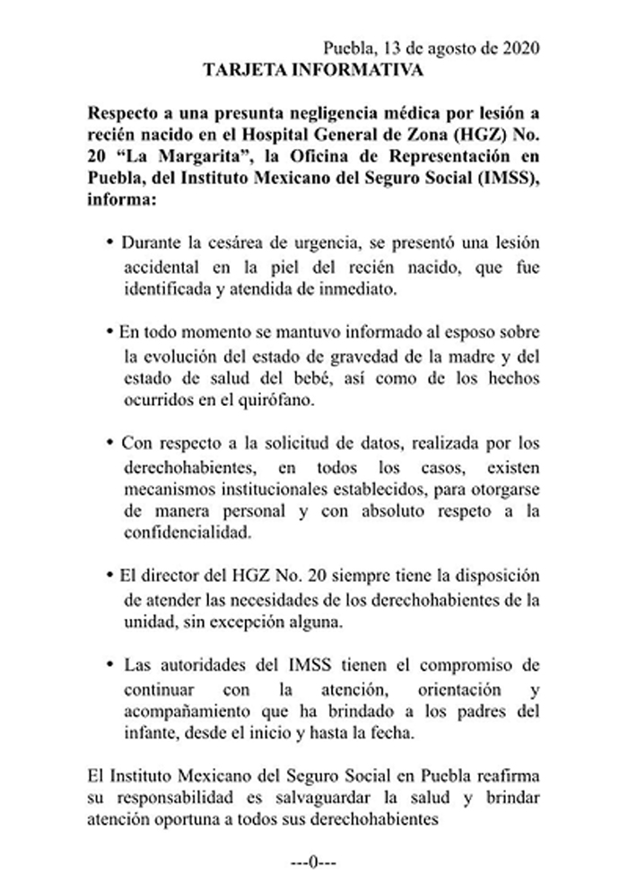 A través de una tarjeta informativa, el IMSS también aseguró que en todo momento se mantuvo informado al padre del menor sobre el estado de salud de la mamá y la evolución del bebé, así como los hechos ocurridos en quirófano.