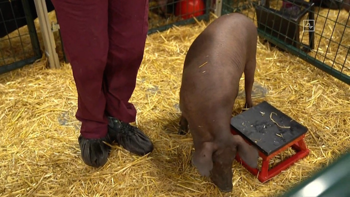 Musk mostró a los espectadores una pantalla que reproducía un sonido y mostraba un pico visual cada vez que el dispositivo detectaba que Gertrude tocaba algo con su hocico mientras buscaba comida.