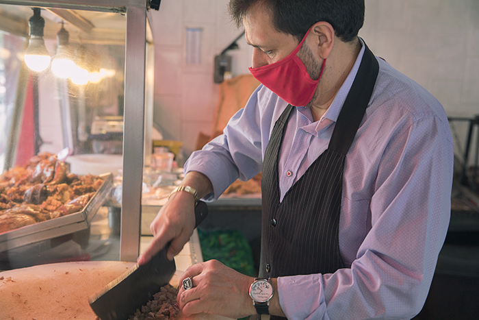 Rocío González Díaz, dueña de la cocina económica “El Volcancito”, comenta: “Este es un negocio familiar, nosotros somos la tercera generación. Trabajamos aproximadamente nueve personas, son nueve familias que dependen de aquí. La pandemia nos ha afectado en el aspecto económico, nos empezó a ir muy mal, tenía yo que solventar gastos que a veces no podía ya cubrir, pero afortunadamente hemos salido adelante, afortunadamente no tuvimos que cerrar; ya el gobierno permitió que pudiéramos abrir al 30 por ciento. Tu Cocina Local me ha apoyado mucho en cuanto a los manteles, en cuanto a las mamparas; eso ha ayudado mucho a que el cliente se sienta seguro para poder comer”.