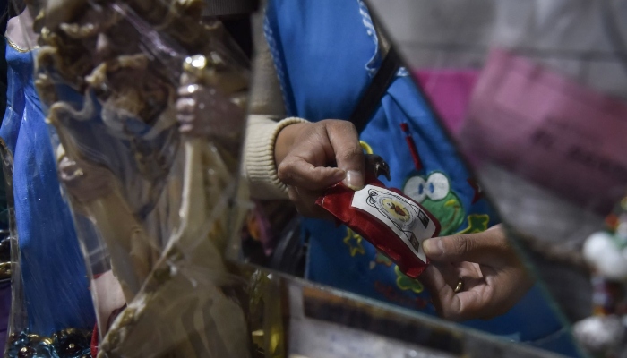 Irma, trabajadora del mercado, vende este kit que consta de un aceite con la imagen del mandatario mexicano, una imagen de "Detente, el corazón de Jesús" y un amuleto, y únicamente se comercializa bajo pedido previo.