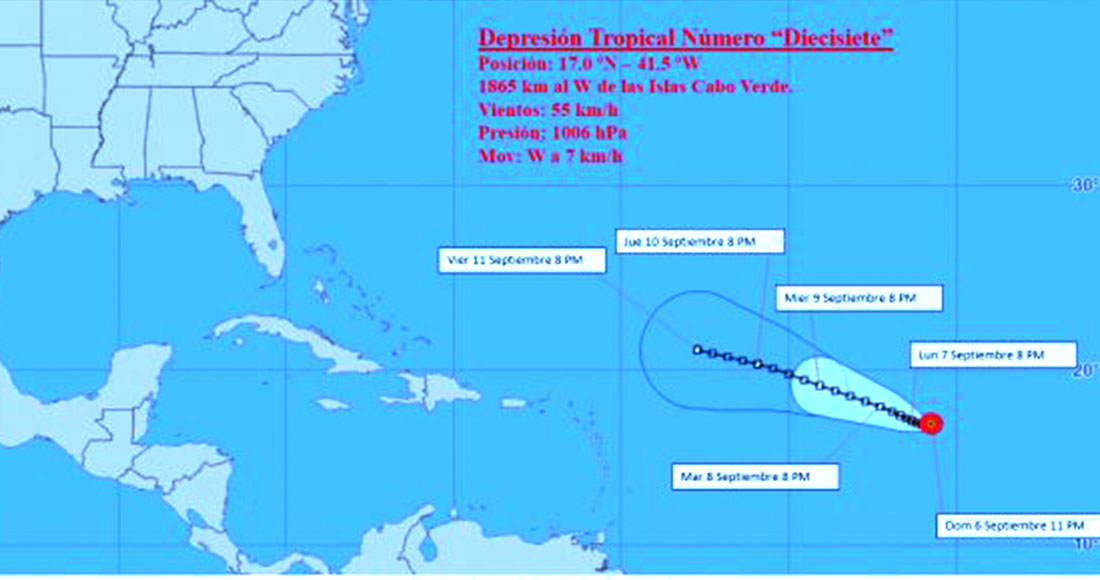 El sistema tenía su centro unos 2 mil 140 kilómetros (mil 330 millas) al oeste de las islas de Cabo Verde y avanzaba hacia el noroeste a 9 kilómetros (6 millas) por hora sin suponer una amenaza para tierra por el momento.