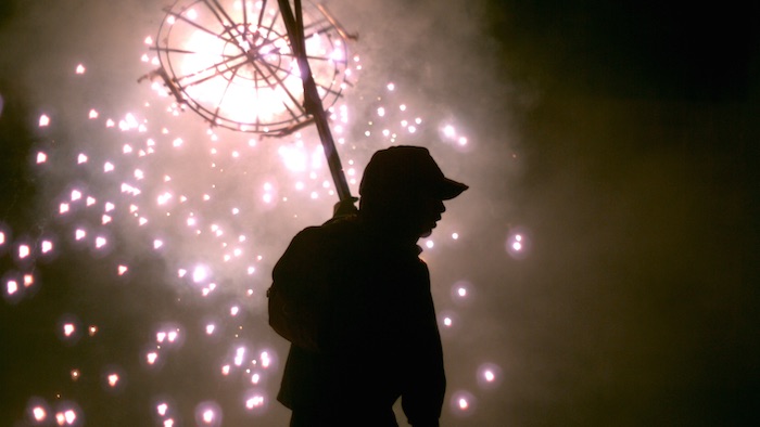 Un trabajador sostiene una rueda de cohetes en una escena del documental Pólvora y gloria. Foto: AP