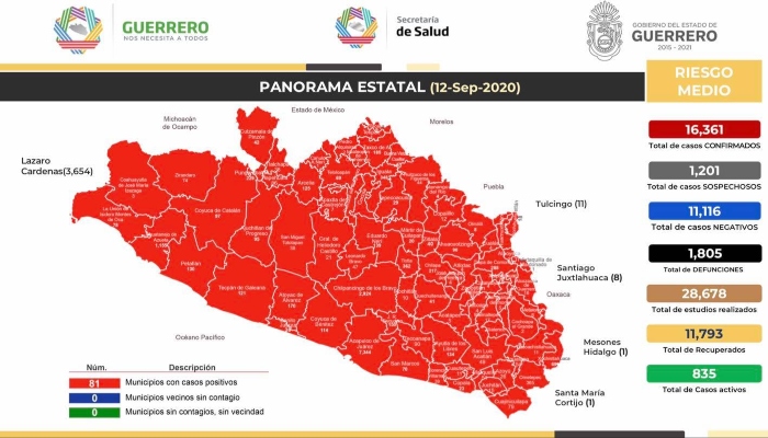 Chilpancingo, Guerrero, 12 de septiembre (ElSur).- El Secretario de Salud estatal, Carlos de la Peña Pintos, informó que van 16 mil 361 casos de coronavirus, mil 805 defunciones y hay 835 casos activos.