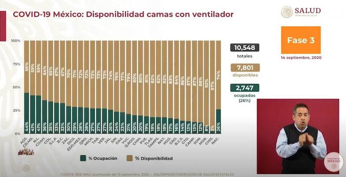Por camas con ventilador, la media nacional es del 26 por ciento. De los 10 mil 548 espacios disponibles, 2 mil 747 tienen un paciente con apoyo respiratorio.