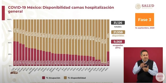 Sobre la ocupación hospitalaria de camas generales, la media nacional se ubica en 31 por ciento. De los 31 mil 126 espacios disponibles, 9 mil 568 cuentan con un paciente.