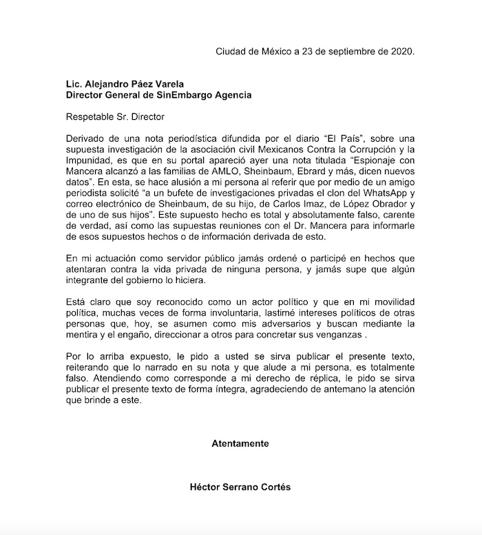 A continuación, SinEmbargo reproduce íntegra una carta de Héctor Serrano Cortés, atendiendo a su derecho de réplica: