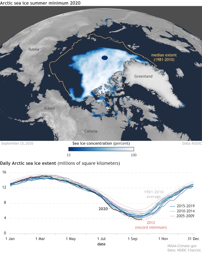 Los años 2020 y 2012 siguen siendo los únicos años en los que la extensión del hielo marino ha caído por debajo de los cuatro millones de kilómetros cuadrados (1.54 millones de millas cuadradas).