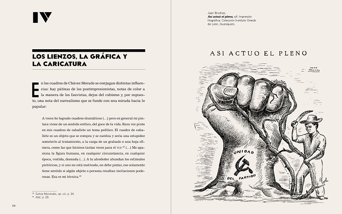 Villasana también analiza dos aspectos importantes en la vida de Chávez Morado: su militancia política y el influjo de Olga Costa en su vida. Se sabe que el artista fue parte del Partido Comunista Mexicano, aunque siempre tuvo una mirada crítica y autónoma hacia el movimiento obrero. Esta rebeldía lo llevo a romper con Siqueiros y alejarse del partido y de la ciudad. Y, aunque ya no era miembro activo del partido, siguió militando en la izquierda, haciendo carteles y caricaturas mordaces. Hizo de su arte un golpe político. Esa militancia fue compartida con Olga Costa, pintora e hija de un exiliado alemán. Ella no sólo fue pareja sentimental de Morado, sino también su complemento artístico, como queda retratado en Bicéfalo, obra que muestra la cabeza de los dos en un solo cuerpo. Dicha pieza es el reflejo de la influencia de esta pintora en el trabajo del guanajuatense.