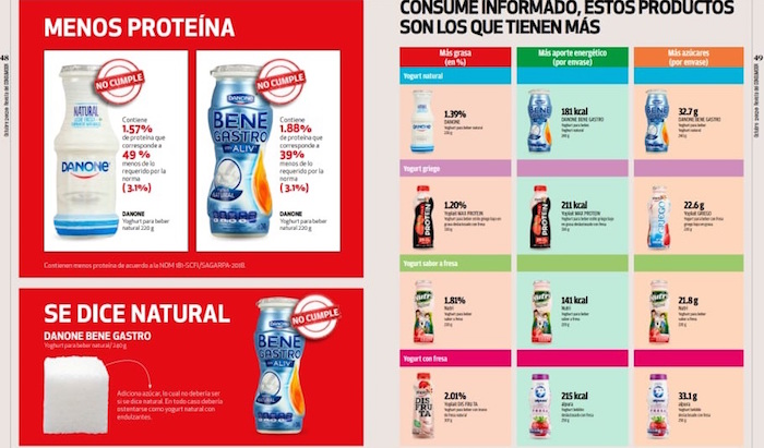 En ese sentido, el análisis realizado entre el 27 de mayo y el 25 de julio incluyó 537 pruebas a 21 productos que usan la denominación "yogur" para beber naturales y con fresa o sabor a fresa, observó también que aquellos que tienen menos proteína son Danone Yoghurt para beber natural 220g, ya que contiene 1.57 por ciento de proteína, es decir, 49por ciento menos del requerido por norma, que es de 3.1 por ciento.