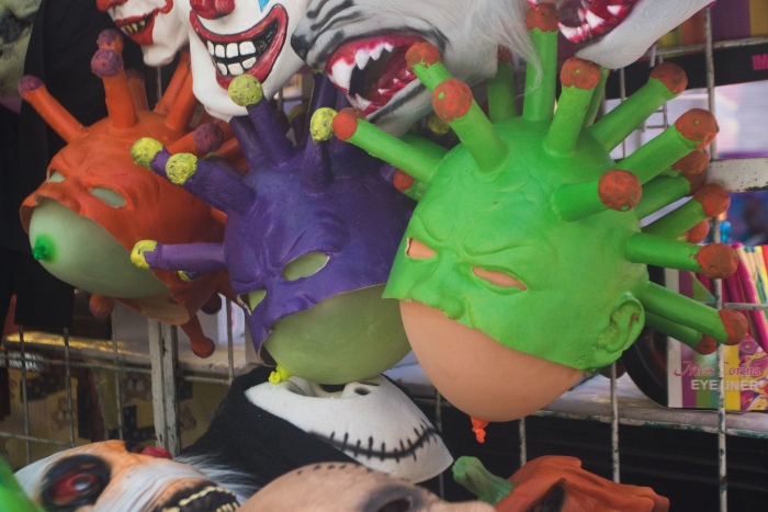 También se venden antifaces con una especie de gorro integrado que aparenta los característicos picos del virus.