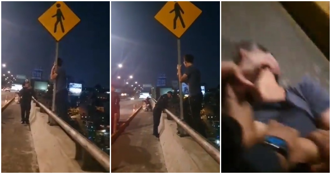 En un video publicado en Twitter por el periodista Jorge Becerril, se observa a un hombre abrazado a una señal de tránsito sobre la barda de un puente mientras que un policía dialoga con él.