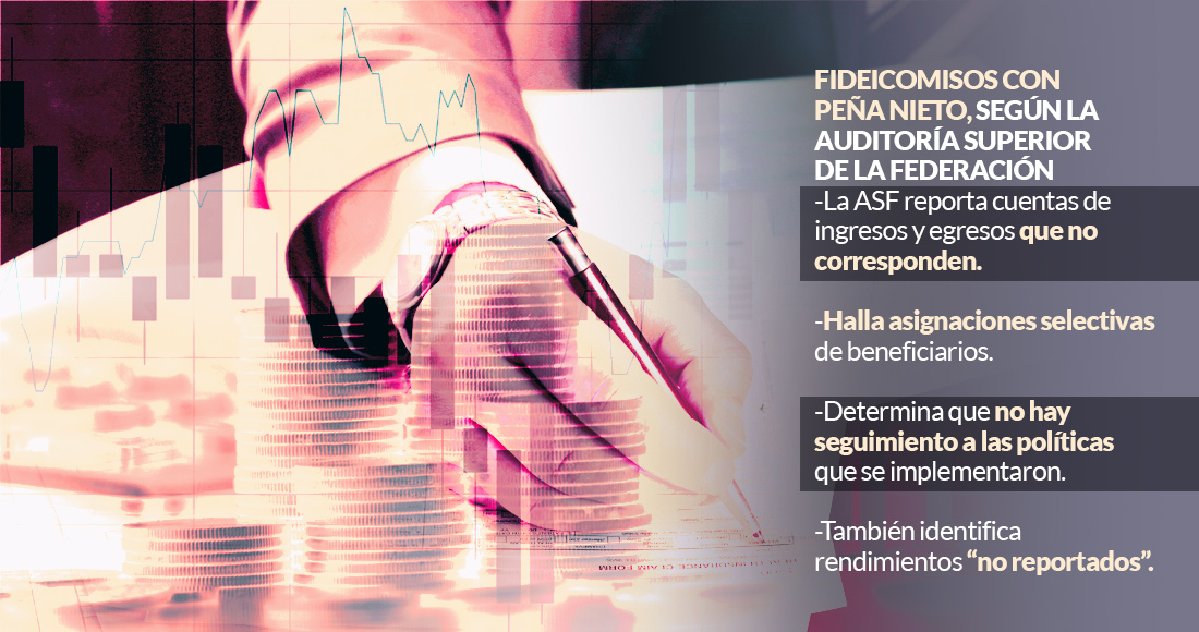 Ciudad de México, 22 de octubre (SinEmbargo).- De 80 auditorías realizadas a los fideicomisos activos en 2018, el último año de la administración federal de Enrique Peña Nieto, la Auditoría Superior de la Federación (ASF) envió a las autoridades 97 acciones referentes a una mala rendición de cuentas, incumplimientos en los procesos para disponer y aplicar los recursos e incumplimiento en los procesos de adjudicación de contratos, así como fallas en la ejecución de éstos.