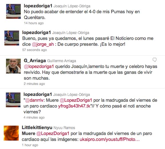 La muerte de Joaquín López Dóriga tomó por sorpresa hasta al mismo "Teacher" quien se sorprendió de la noticia dada a conocer por Twitter. El asunto fue tomado con ligereza por el titular de El Noticiero quien hizo bromas respecto a su deceso, a la par de sus seguidores quienes lo secundaron con ingenio todo el fin de semana. El asunto para López Dóriga, quizá, no fue tan importante como el hecho de que su equipo de futbol favorito se encuentre en una mala racha.