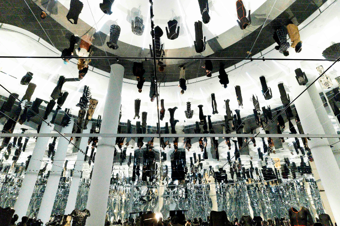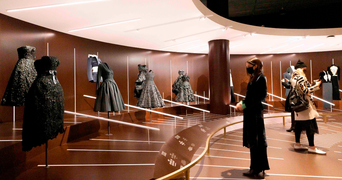 La cronología de trajes se despliega en dos galerías que confluyen en una enorme esfera de un reloj marcado con 60 minutos, mientras que detrás de cada uno de ellos se exhiben dos diseños, uno de ellos representando la naturaleza lineal de la moda, y el otro, el carácter cíclico.