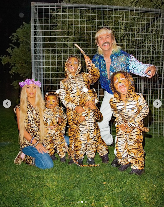 Por su parte, Kim Kardashian se caracterizó de Carole Baskin, la estrella de Tiger King, y para completar el disfraz sus cuatro hijos estaban vestidos de leopardos, mientras su amigo Jonathan Cheban se hizo pasar por Joe Exotic.