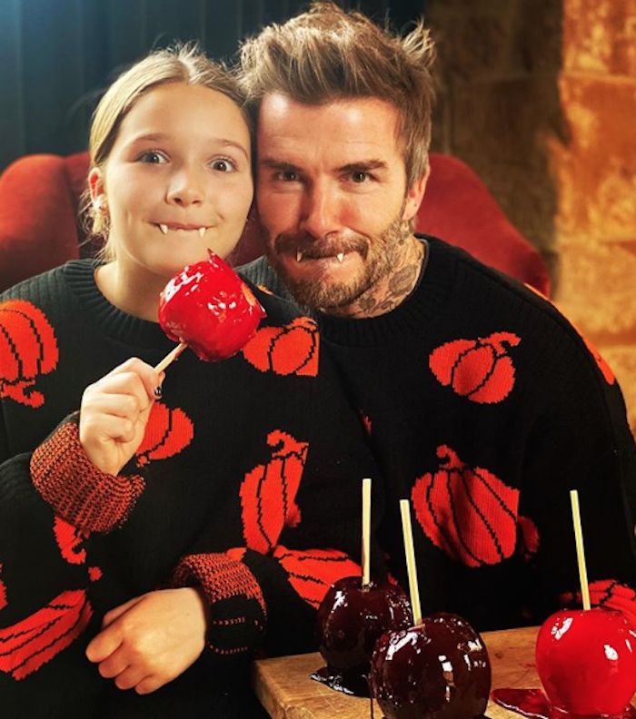 David Beckham y su hija, Harper, lucieron unos suéteres negros con estampado de calabazas y para terminar el look se pusieron unos colmillos de vampiro.
