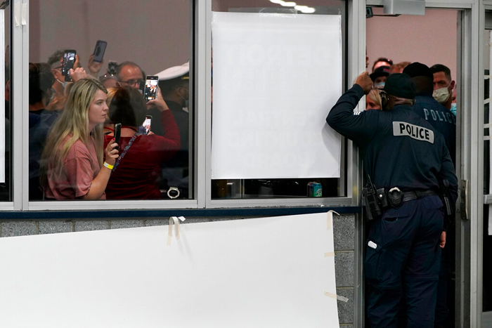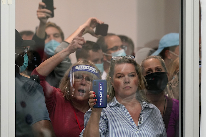 Un video grabado por medios locales mostraba a manifestantes descontentos reunidos afuera del centro de convenciones TCF y dentro del vestíbulo, gritando consignas de “¡Detengan el conteo!” y “¡Detengan la votación!”. Varios policías impidieron que ingresaran a la zona de conteo de votos.