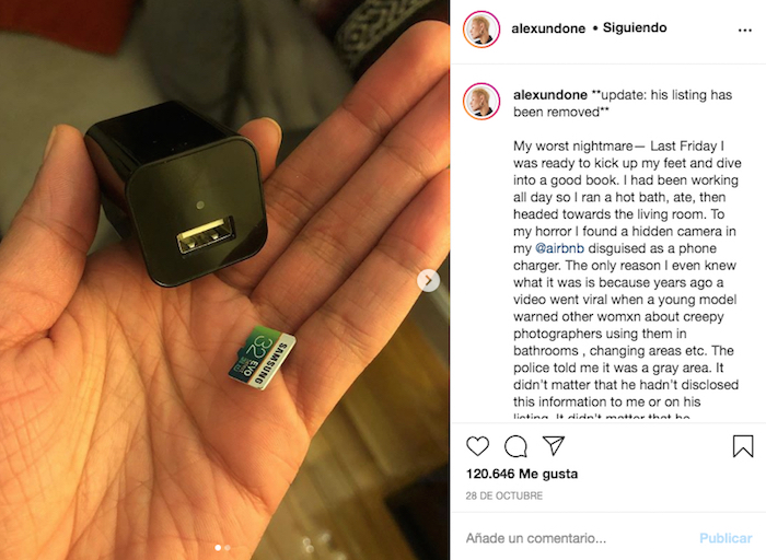 Brooklyn, 9 de noviembre (RT).- Una modelo estadounidense que había alquilado un alojamiento a través de la plataforma Airbnb en el distrito de Brooklyn (Nueva York), descubrió durante su estadía una cámara oculta disfrazada de cargador de teléfono. Alex Undone decidió compartir su experiencia para evitar que otras personas pasen por lo que ella calificó como su "peor pesadilla".