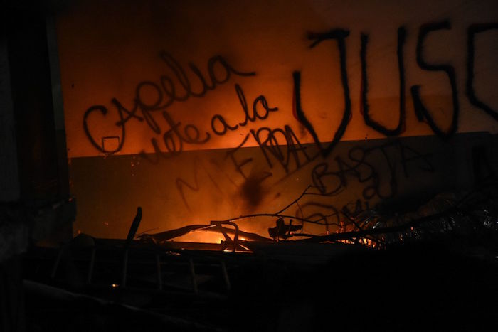 Un video de la usuaria identificada como Paola Chiomante para Novedades de Quintana Roo muestra a las manifestantes quemando una tabla de madera que les impedía el ingreso al Palacio Municipal, cuando de pronto los policías comenzaron a disparar. Tras ello, las personas al exterior del palacio comenzaron a correr en busca de refugio.