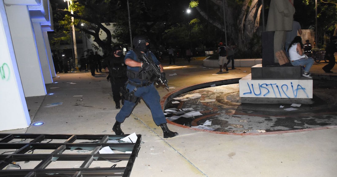 La protesta llegó al ayuntamiento de Benito Juárez, Cancún, donde la policía previamente clausuró la entrada con vallas metálicas y posteriormente comenzaron las detonaciones de armas de fuego, esto luego de que colectivos de mujeres entraran a las instalaciones para exigir justicia por los feminicidios del pasado fin de semana.
