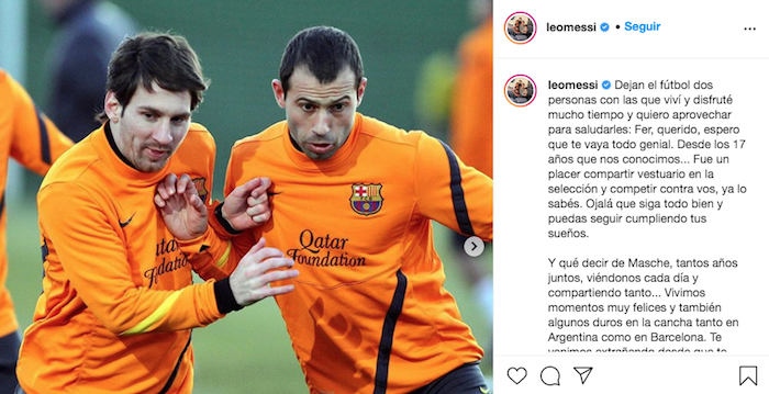 "Dejan el futbol dos personas con las que viví y disfruté mucho tiempo y quiero aprovechar para saludarles", escribió Messi en su cuenta de Instagram.